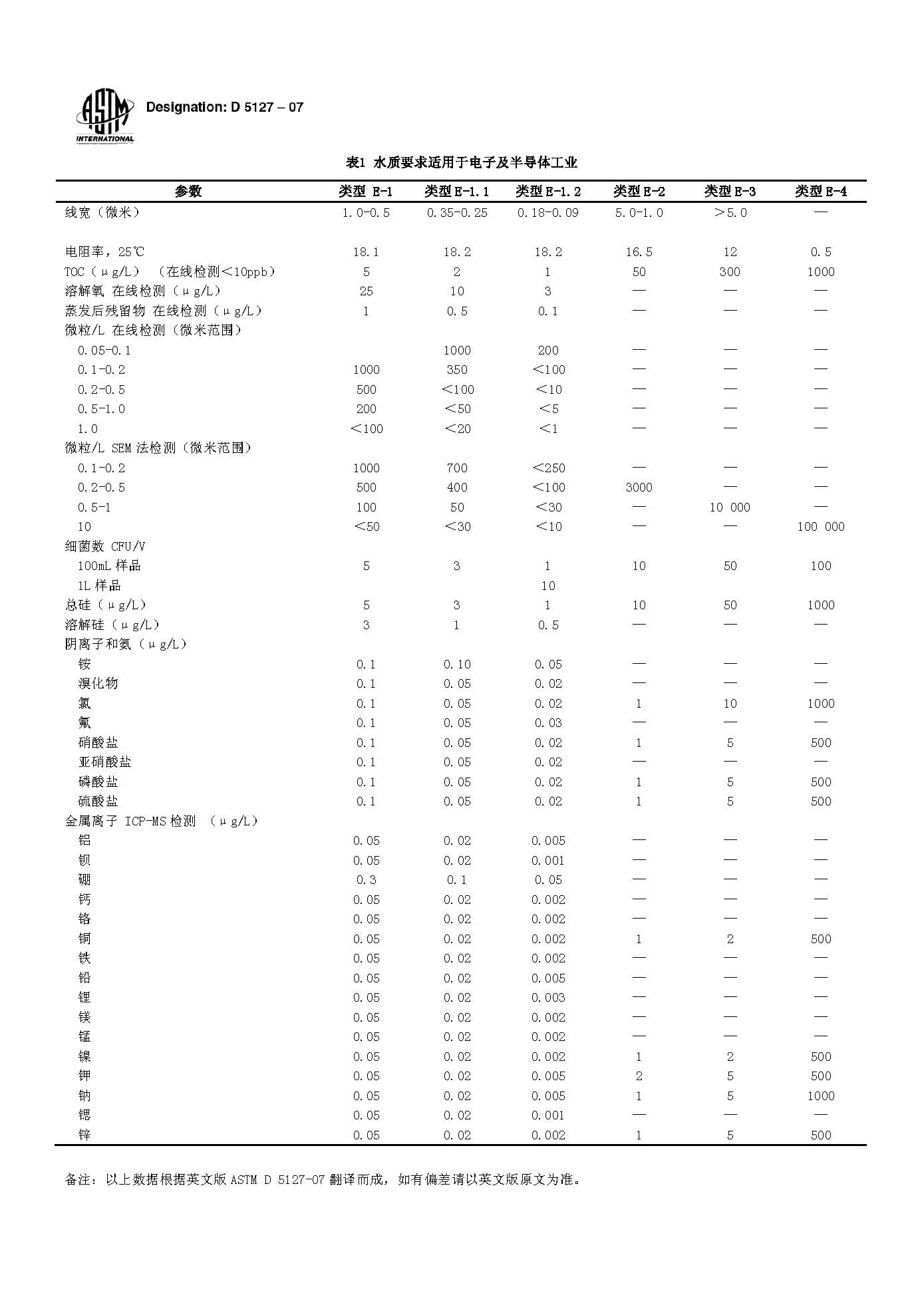 纯水、高纯水和超纯水都是利用自来水、地表水或地下水等为水源,经过预处理后,通过电渗析法(ED)、离子交换器法、反渗透法(RO)、电去离子法(EDI)等方法脱盐后,再联合紫外线杀菌器、脱气膜等设备进一步精处理,他们最主要的区别是水中含有的电导率(电阻率)、颗粒、TOC、细菌、溶解氧等水质指标,水中杂质如果吸附或残留在产品表面,会导致产品特性变差。如果以电阻率做为参考值来划分,纯水电阻率一般要求小于0.5MΩ.cm,高纯水电阻率一般要求10-17MΩ.cm,超纯水电阻率一般要求大于18MΩ.cm,其他数据可参考《ASTM D5127-07 表1:适用于电子及半导体工业的水质要求》;如果以用途来划分,纯水一般用于普通电子工业(如线路板、电镀等行业)、化工、铅酸电池等行业,高纯水一般用于玻璃、小尺寸液晶屏、光学、半导体封装测试等对用水水质有一定要求的行业,超纯水一般用于光伏、半导体晶圆(芯片)、锂电池等对水质要求较高的行业。
